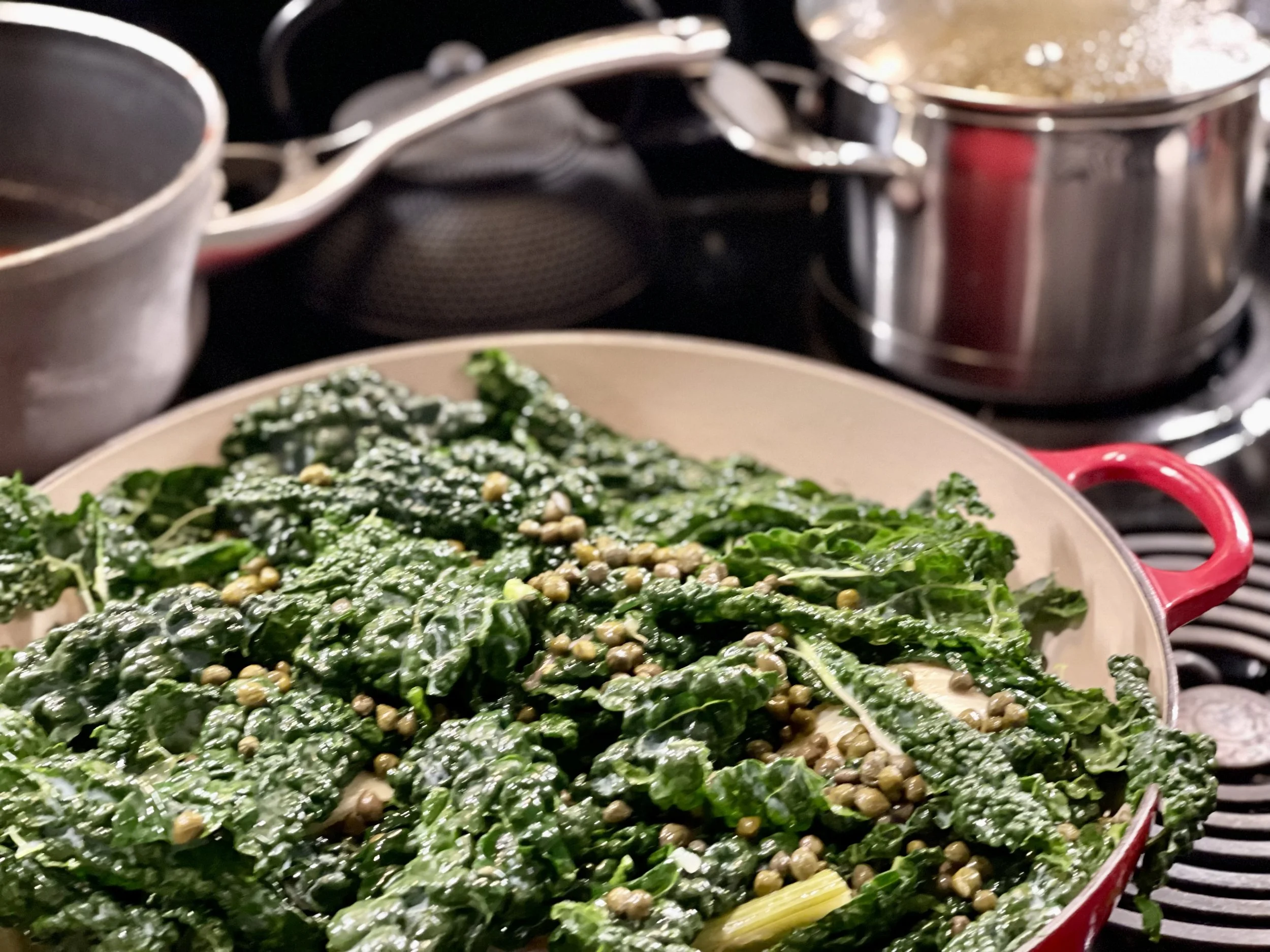 We brought our bounty home and turned it into a one pan dinner that is bright, briny, and cozy, a little fancy without any fuss. The carrot was grated into large ribbons, tossed with cumin and lemony olive oil, and air fried until perfectly crisp. A squeeze of lemon and those capers tucked into the pan with the kale brought everything together. Absolute magic.
